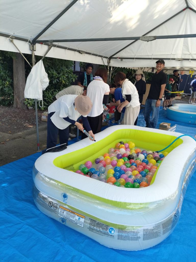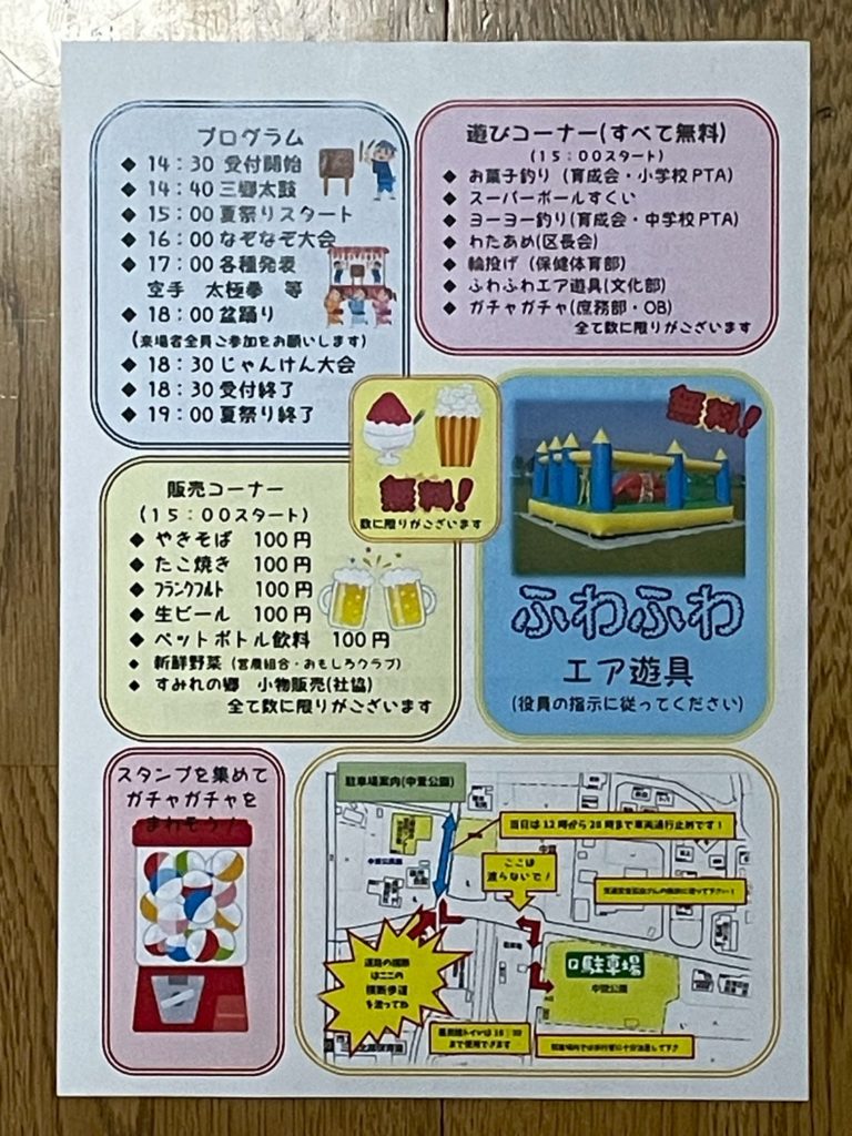 食べ物ブースに遊びブース、ステージ発表、じゃんけん大会、盆踊りと、ふわふわエア遊具、ガチャガチャと、役員で何度も会議を開いて企画を練った夏祭りでしたが、中萱の皆さんは楽しんでいただけたでしょうか…