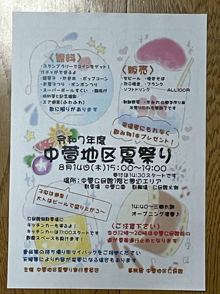 中萱って楽しいな、ここに住んで良かった、ここで子育てしてたら安心だなぁ、ここに住んでいたら孤独な老後なんてないじゃん!公民館て身近な場所なんだ、ここに来れば楽しいじゃん!って思ってもらえたらうれしいです。役員の皆さん、ボランティアの皆さん、OBの皆さん、暑い中本当にお疲れ様でした。ありがとうございました!